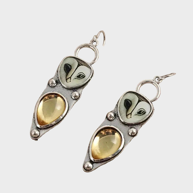 Ανακαλύψτε τη γοητεία του νυχτερινού δάσους με αυτά τα μοναδικά, χειροποίητα σκουλαρίκια που συνδυάζουν την τέχνη με τη φύση. Κάθε κομμάτι διαθέτει ένα λεπτομερώς σκαλισμένο πρόσωπο κουκουβάγιας που φωλιάζει πάνω από μια λαμπερή, δακρυόσχημη πέτρα σε μελί απόχρωση, θυμίζοντας τη ζεστασιά του κεχριμπαριού. Με το οξειδωμένο ασημί φινίρισμα που προσδίδει μια vintage μια αίσθηση αλλά τα σκουπίδια, αυτά δεν είναι απλά αξεσουάρ, μικρά έργα τέχνης που προσθέτουν πινελιά σοφίας και κομψότητας σε εμφάνιση.